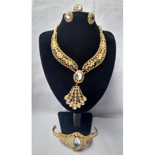 THIS JEWELRY SET IS SURE TO STAND YOU OUT OF A CROWD WITH ITS CLASSIC DESIGN. ITS CONSISTS OF A NECKLACE, RING, BANGLE AND A PAIR OF EARRINGS. EACH PIECE CAN BE ROCKED BY ITSELF TO ACHIEVE THE DESIRED LOOK.