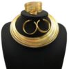 Packaging include:1x Necklace1x?bangles for big ladies1x Ring1x A pair of EarringsSpecificationsKEY FEATURESGold Color Brazilian jewelry set.?Colors 😕 goldNecklace Size : One size fits allEarring hook : ClipRing Size : Adjustable to fit any fingerPackaging : Necklace, Earring, bangles?and Ring.1 to 2 years Guarantee.Product Description