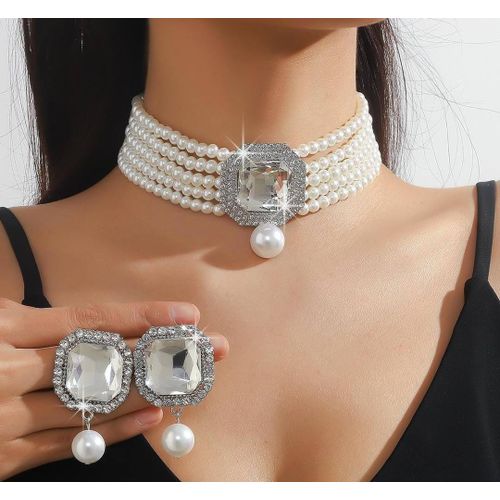 Five Strands Collar Planet Choker Pearl Necklace For Women Girls Wedding Vintage Gifts Set Party Jewelry – White