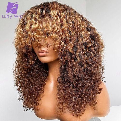 Special GiftKinky Curly Wigs With BangsHair Color: #27 defaultHair Density: 150% 180% 200% DensityCap size: Medium defaultCap color: Medium brown defaultProduct PicturePicture effect:24inch 200% DensityCap Constructions